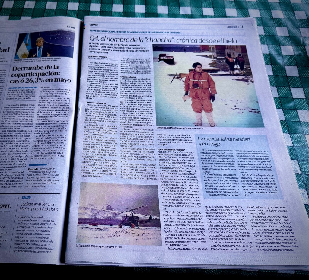 Hace unos días, una nota publicada en el diario «La voz del Interior» en caracter de espacio institucional del Colegio de Agrimensores de Córdoba trajo de regreso un recuerdo que llevaba décadas guardado. El título era claro y simple: Q4, el nombre de la chancha: crónica desde el hielo, pero detrás de esas líneas se revive una experiencia vital ocurrida en 1974, cuando todavía éramos jóvenes, audaces y, quizás, un poco inconscientes.